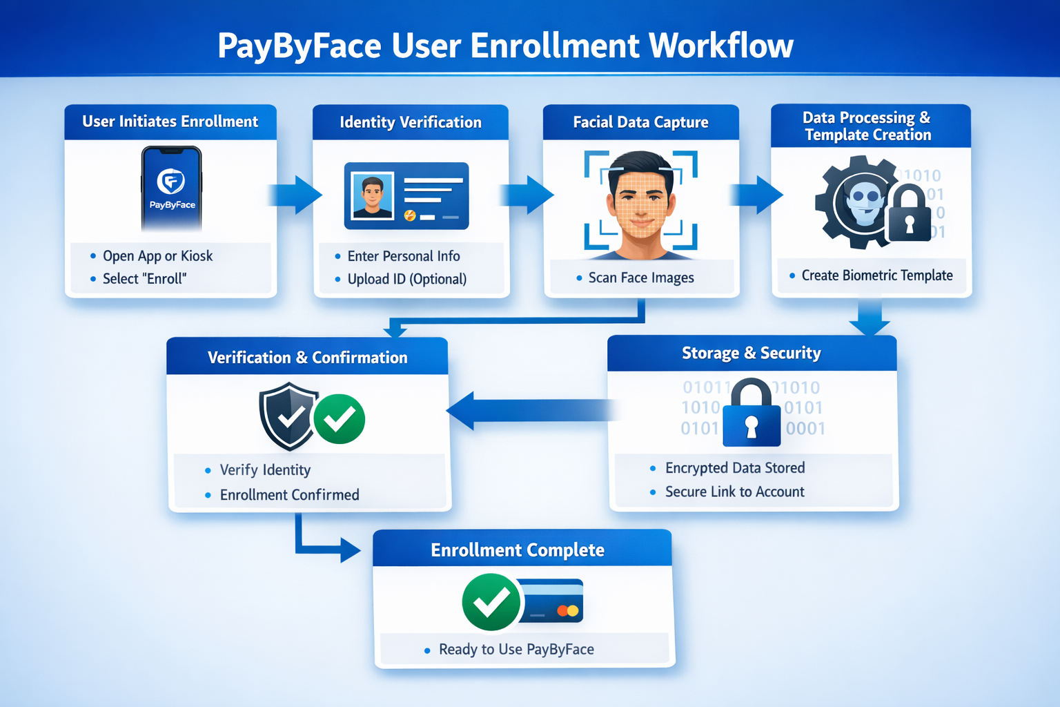 PayByFace systems follow a simple but secure workflow designed to protect both users and merchants.
