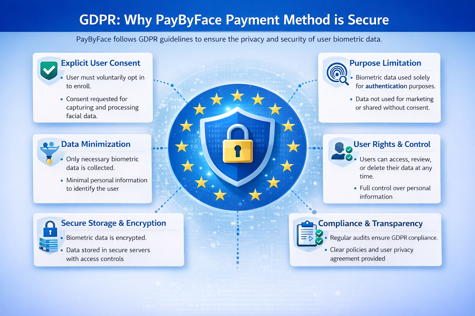 Most Pay by Face systems operate on an opt-in basis. Users must explicitly agree to enroll and can choose whether to use facial biometrics for payments.